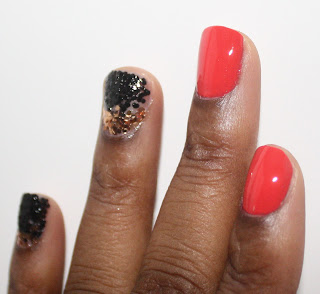 On my two accent nails I wanted to do something different to match up it with some Leopard Air Max 1's that I am wearing (will wear to work). I didn't want to do the leopard print because it would be too much of an expectation if you're planning on matching your nails & kicks. So I just used some glitter tubes I got from Michael's, I put clear polish first then I sprinkled gold/copper looking and black chunky glitter on my nails. I applied a top coat and viola', done.