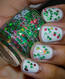 Lastly, this is Kringle All the Way. It is a glitter top coat with circle glitters in red, green and silver. I really liked the color combo in this, perfect for the upcoming Christmas holiday. If you're looking for the perfect festive polish, look no further than this model. I wasn't able to pick up the larger silver circle glitters as I would have liked to on the first try, but giving the bottle a shake and twist provided me a better opportunity.